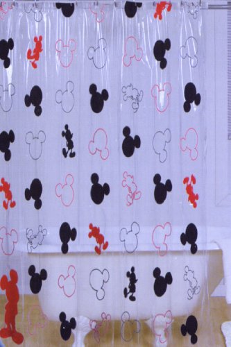 Kids clear vinyl shower curtain, fun for all ages, adults too. Disney's Playhouse Mickey Mouse head silhouette is printed in red and black on a clear background, button hole top for easy hanging. 100% PEVA Eco-Friendly and Chlorine Free - Safe for the whole family. Measures 70 x 72 inches. Wipe clean with damp cloth.